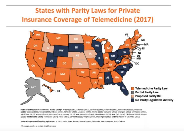 This future of healthcare has been accelerated because of easing regulation on telemedicine definition, reimbursements and coverage. Already in 32 states and the District of Columbia there are parity laws that require private insurers to cover telemedicine visits the same way they cover in-person encounters, and in 49 states and District of Columbia reimbursements are now provided for video visits in Medicaid fee-for-service programs.