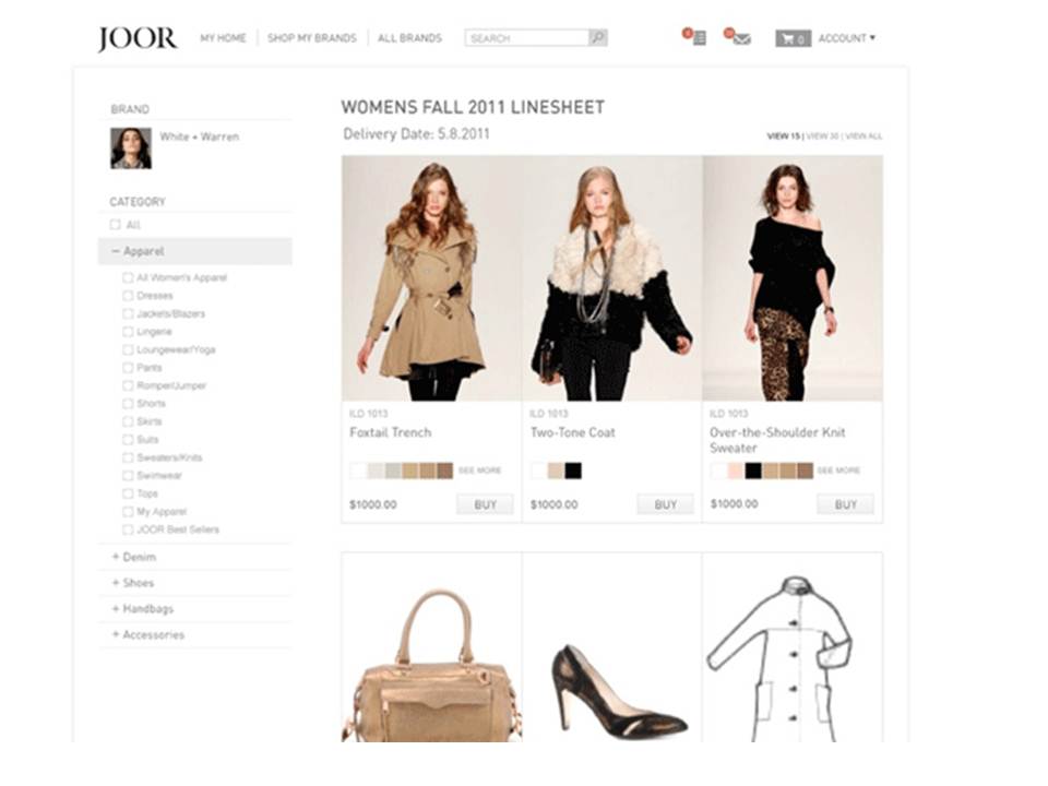 Joor is an online wholesale fashion marketplace that provides a digital platform to help streamline communication, discovery, and transactions between designers and retailers. Brands can feature their collections, search for potential boutiques and manage all of their orders online. Boutiques are able to access real-time information on a brand’s sales team and inventory availability.